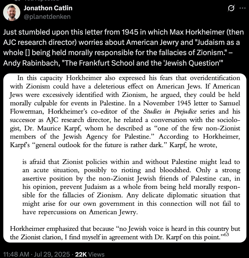 That’s Max Horkheimer of Horkheimer and Adorno, of course. As Catlin notes, this comes from the essay “The Frankfurt School and the ‘Jewish Question,’ 1940–1970” by Anson Rabinbach, who passed away just this year, was a brilliant student of the legendary scholar George Mosse. It’s collected in Staging the Third Reich: Essays in Cultural and Intellectual History, along with many other fascinating papers.