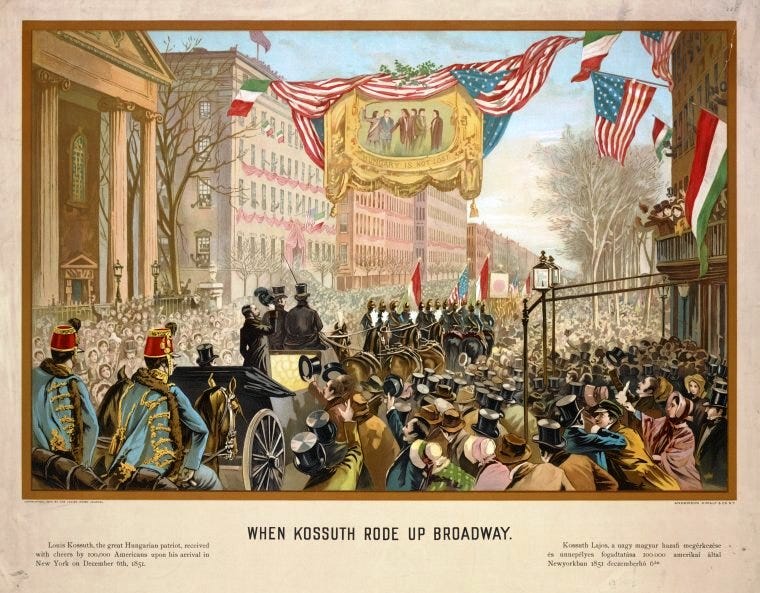 It is not the first time The Democracy, as they used to call the cause writ large, has looked to Hungary for inspiration. I’m reminded of the hero’s welcome Lajos Kossuth received in the United States in the 1850s. He was thronged by adoring crowds, and the country briefly fell under a mania for all things Hungarian. Abraham Lincoln joined other leading citizens of Springfield, Illinois, to call a meeting in honor of Kossuth, and they issued a resolution in support of Hungary’s revolution. Some sources say they met; there’s not much hard evidence for that, but perhaps in the Gettysburg address, there’s an echo of a line in Kossuth’s 1852 speech in Columbus, Ohio—“The spirit of our age is Democracy. All for the people, and all by the people. Nothing about the people without the people – That is Democracy!”