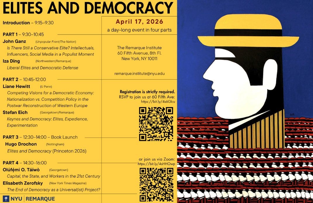On Friday, April 17th, I will be giving a presentation as part of the day-long “Elites and Democracy” event at NYU’s Remarque Institute. You can register online to attend or tune in on Zoom.