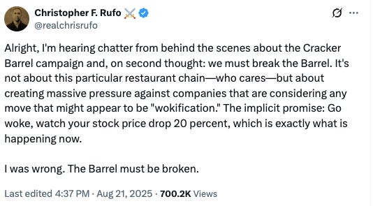 For a brand whose whole thing is nostalgia, I think it’s a pretty stupid idea to touch anything. But touch it they did: now, the stock has fallen, and a whole culture war fracas has started up. People suspect that the “liberal elites” are responsible for the destruction of their beloved brand. (Or, even, as it’s implied or sometimes said openly, the Jews.) The removal of the kindly old white man has raised racial anxieties about the “replacement” of “heritage Americans.” (They don’t call it cracker barrel for nothing, right? Sorry, I haven’t been able to make this bit work yet, but seriously, Cracker Barrel once had to settle a federal Civil Rights lawsuit under the George W. Bush administration for discriminating against minority customers.) Essentially, Cracker Barrel is thought to have gone woke. “We take no pleasure in reporting that Cracker Barrel has fallen,” one conservative organization tweeted, as if it were a city being sacked by barbarians. One of the right’s chief demagogues, Christopher Rufo, who never misses a trick, even jumped in on the action: