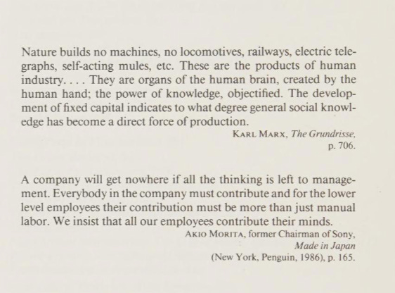 Kenney and Florida hang on to their hardcore Marxian bona fides by placing the emergence of the Fujtuist model within the history of class conflict in the Japanese factory, and they assure their readers, “Far from being romantic or naive, this view recognizes quite explicitly that the new industrial revolution exploits the worker more completely and totally than before.” But there’s a clear excitement and deep curiosity about what they saw happening in Japan. There’s a reason why the epigraph of the book sets Marx’s words alongside those of the chief of Sony.—